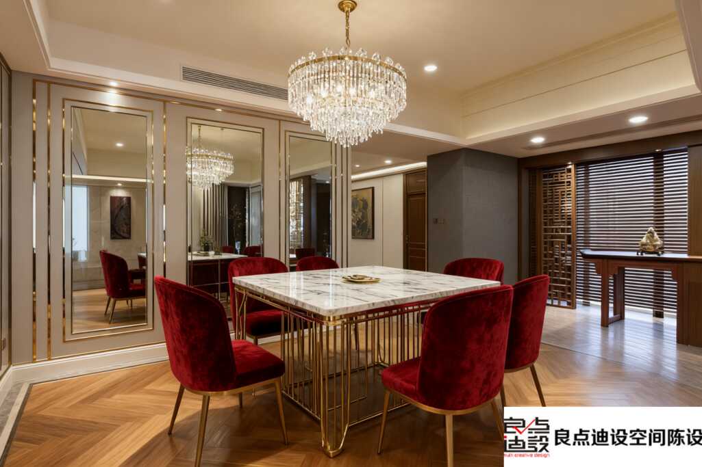 一進門,視線根本挪不開。暖金色的花紋壁紙打了***底子,不像那種“土豪金”,是帶著細膩肌理的啞光質感,光線一照,整個空間都溫潤了起來。頂上水晶吊燈必須擁有姓名,不是那種夸張的宮廷款,線條利落,光影灑下來,剛好和壁紙的金色呼應,氛圍感直接拉滿。