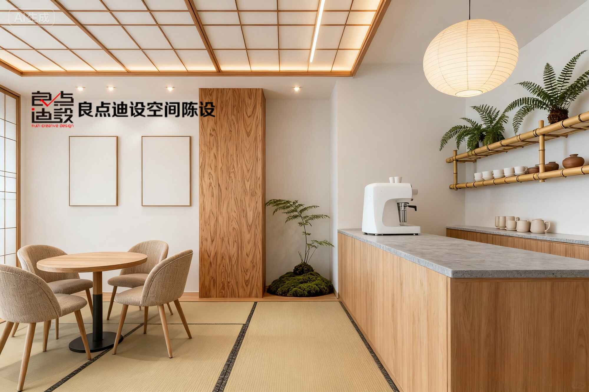 燈光更是心機滿分!木質格子天井嵌了暖光燈帶,光線透過宣紙燈罩柔得像自帶濾鏡。墻上留白畫框和角落苔蘚盆栽里的蕨葉,瞬間把自然感拉滿。整體木色+米白+淺咖的配色,治愈又不失高級,手機原相機直出都能火!