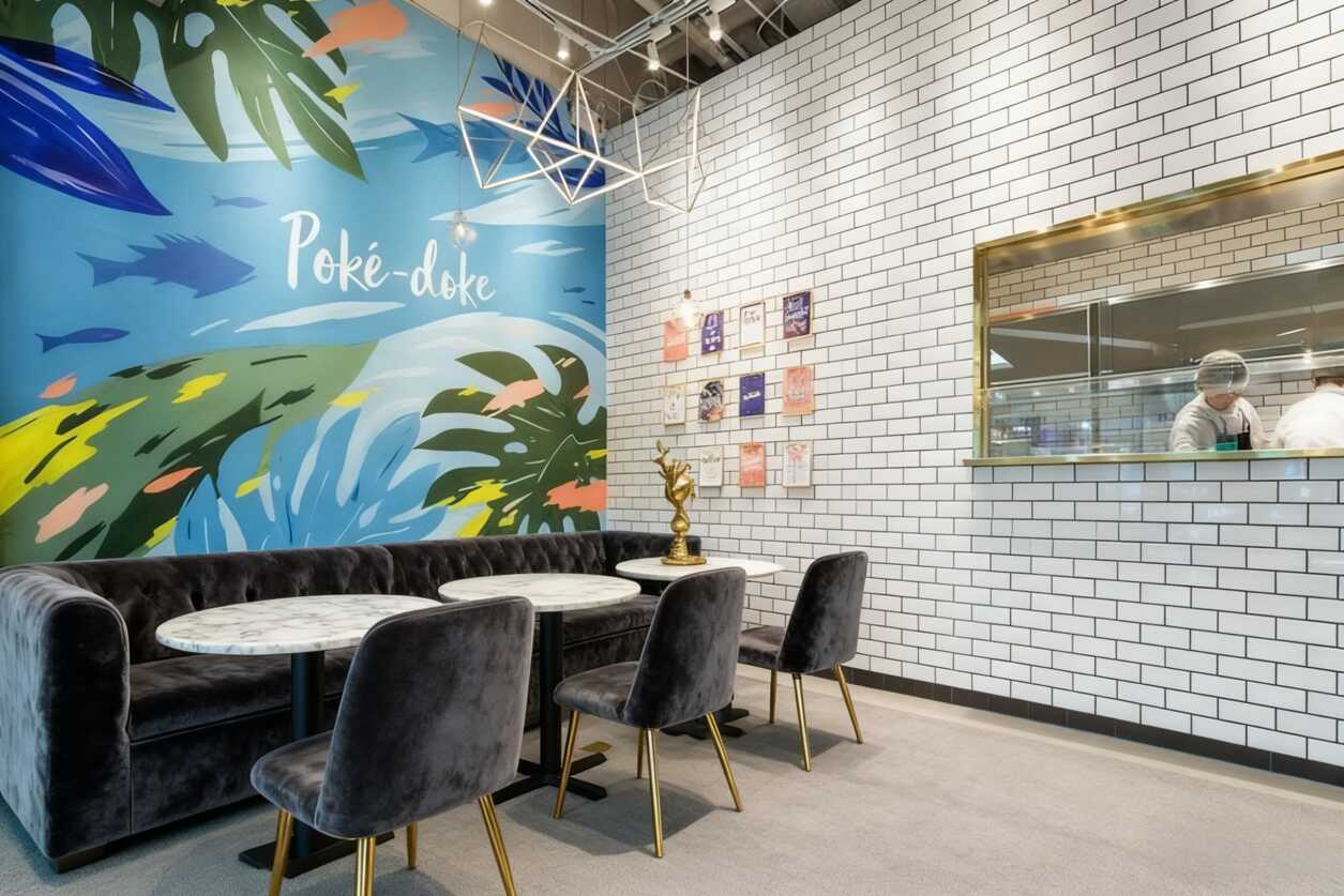 一進門就被這面藍色主題墻拿捏住了!飽和度超正的寶藍色墻上,用白色線條勾勒出“Poke-d”品牌字樣,一條大魚從字母間游過,配上幾片棕櫚葉,瞬間把夏威夷海邊的氛圍搬進室內。別看只是一面墻,它可是整個空間的視覺焦點,拍照當背景板絕絕子!
