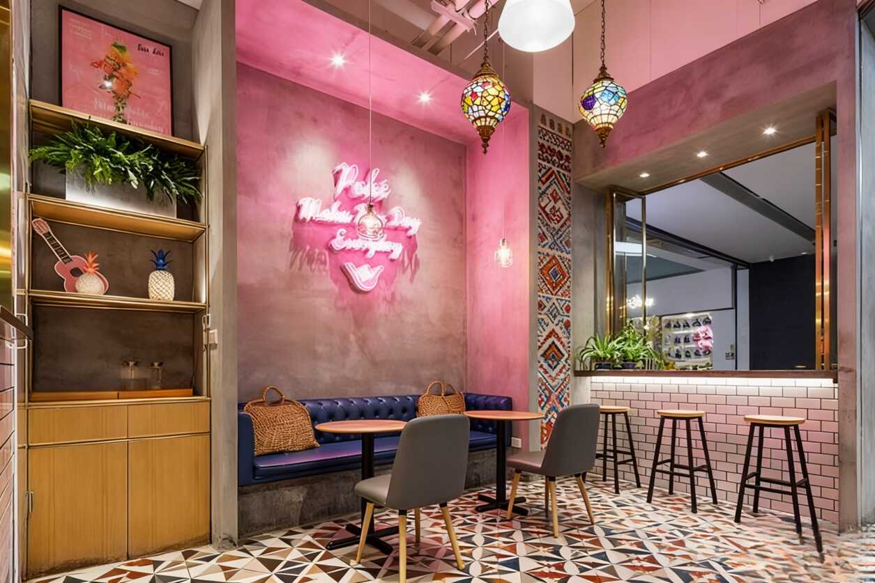 雖然元素多,但主色調其實很克制:地毯的暖色、沙發的藍、綠植的綠,再點綴一面吸睛的粉紅霓虹墻——“EAT GOOD FEEL GOOD”標語直接點題,復古俏皮還能引導顧客拍照傳播。這波操作,老板***是懂營銷的!