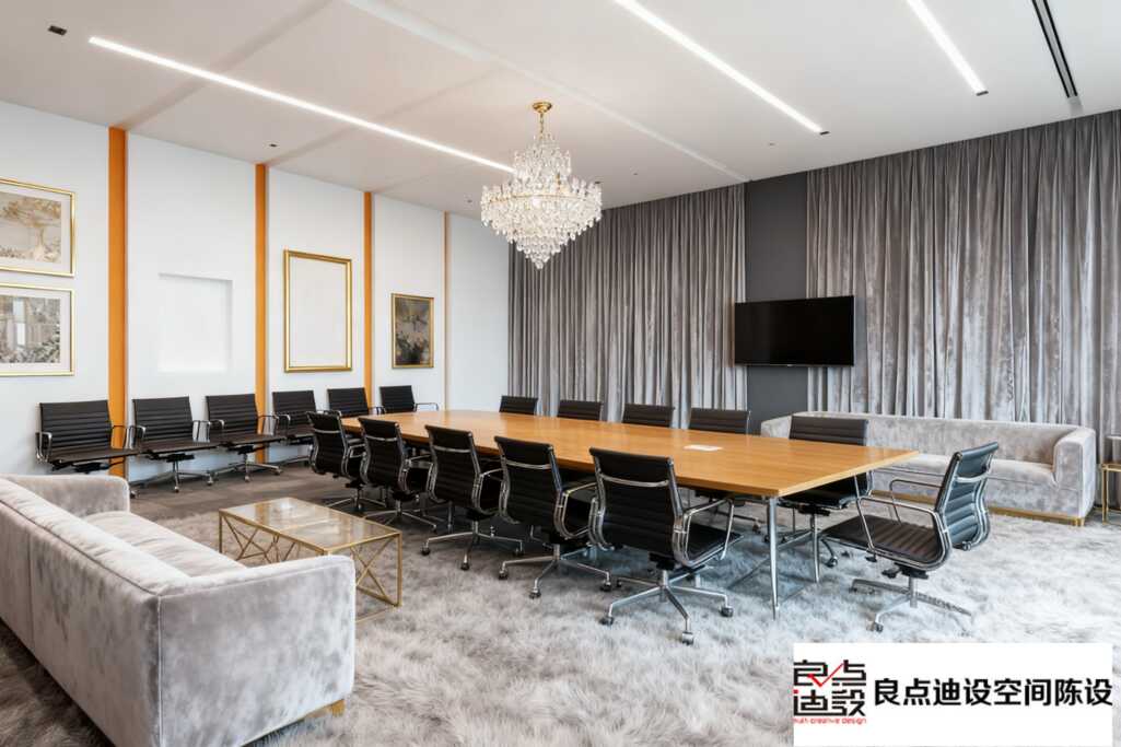 質感會議空間: 長條巖板會議桌+皮質會議椅(帶金屬腳)+特色吊燈。墻面掛大幅抽象畫或質感木飾面,開會都變高級。