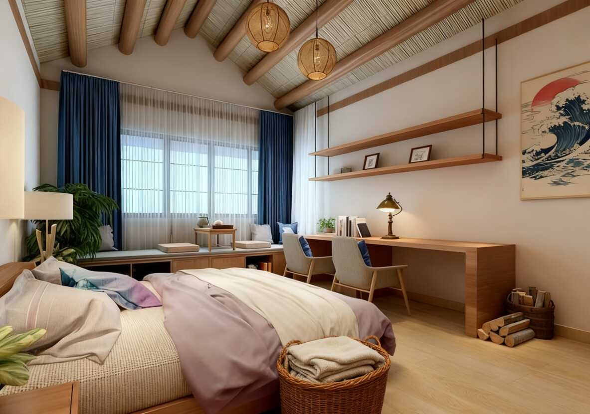 日式混搭風(fēng)民宿軟裝設(shè)計絕了!深藍簾 + 浮世繪 + 藤編燈,住進來就像闖進文藝電影場景