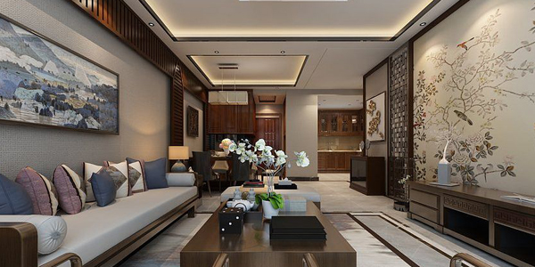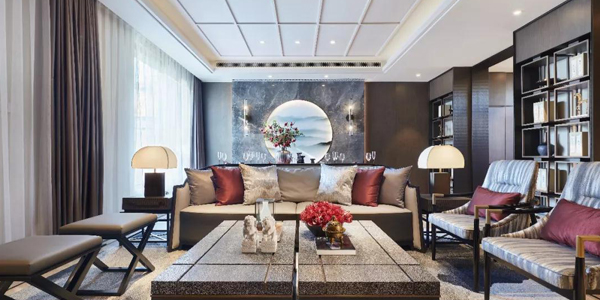 本案里面的中式設計元素比比皆是,山水畫、書法名作、瓷器、茶桌等等,這些裝飾品為這個現代化的空間增添了一抹古韻和別樣的趣味。現代中式的家具,如沙發、以及工藝品等為新中式疊拼別墅樣...