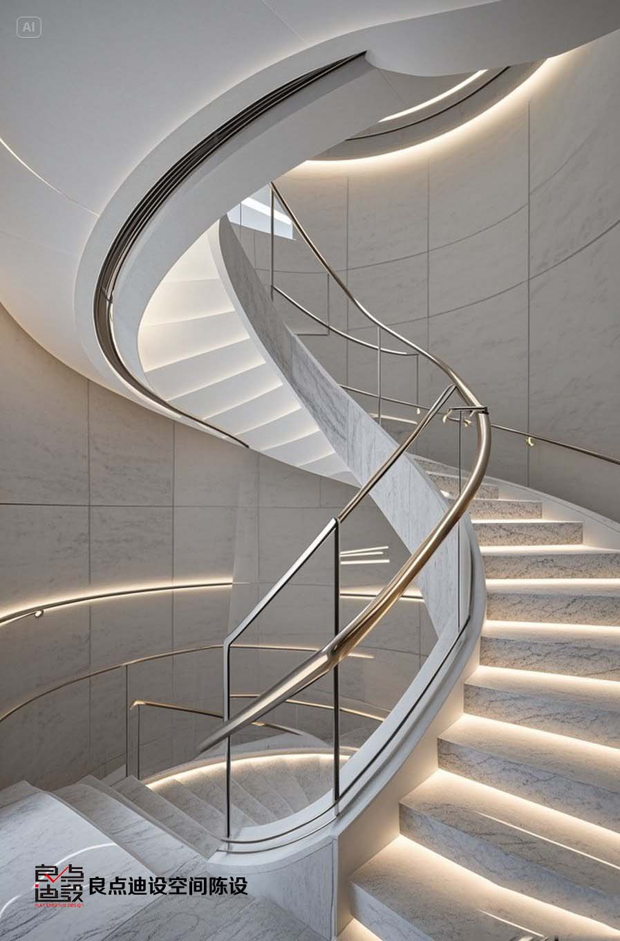 這樓梯的線條也太絲滑了吧??!流暢的曲線宛如一條靈動的絲帶??,從地面盤旋而上,每一個弧度都恰到好處??,給空間增添了一抹獨特的藝術氣息??。