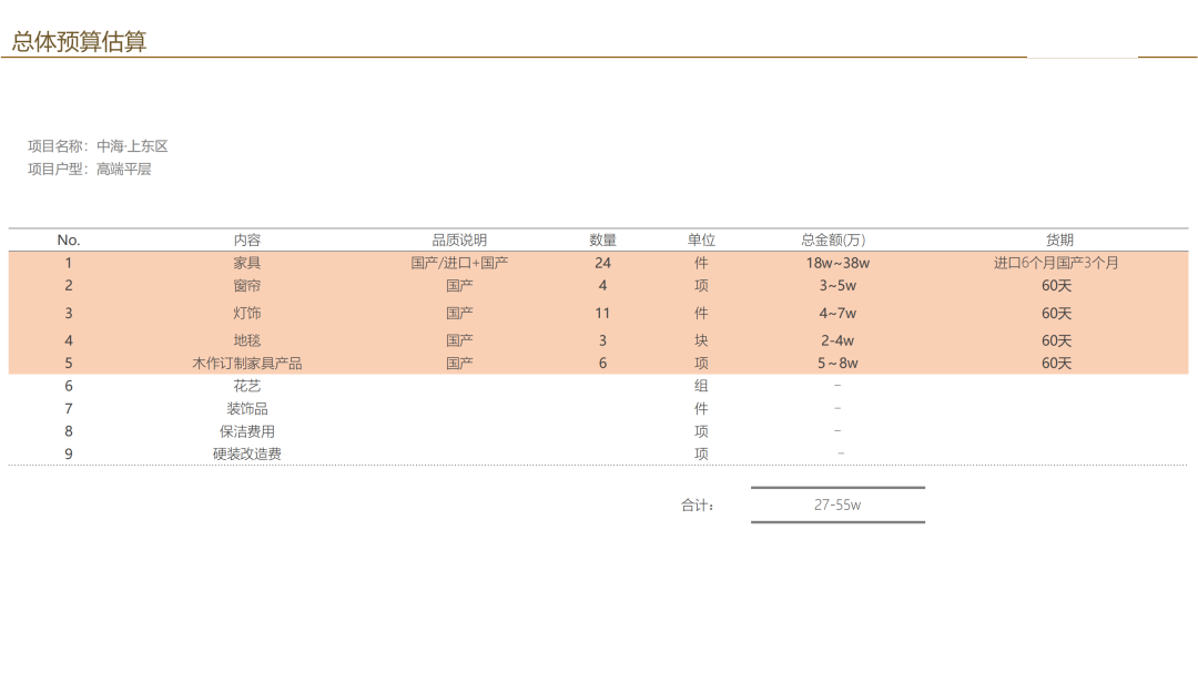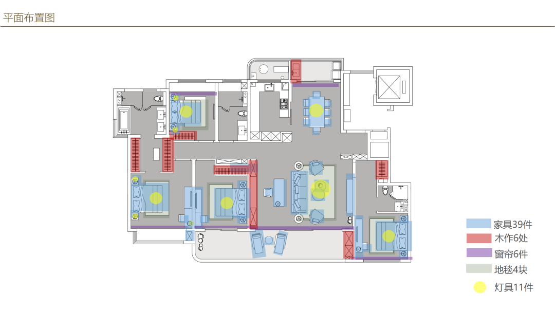 軟裝產(chǎn)品數(shù)量分析圖,軟裝區(qū)別于硬裝的是,軟裝是需要有產(chǎn)品落地的,我們能看出來(lái),家具大致需要39件,木作大致6處,窗簾大致需要6處,地毯大概需要4塊,燈具大致在11件。