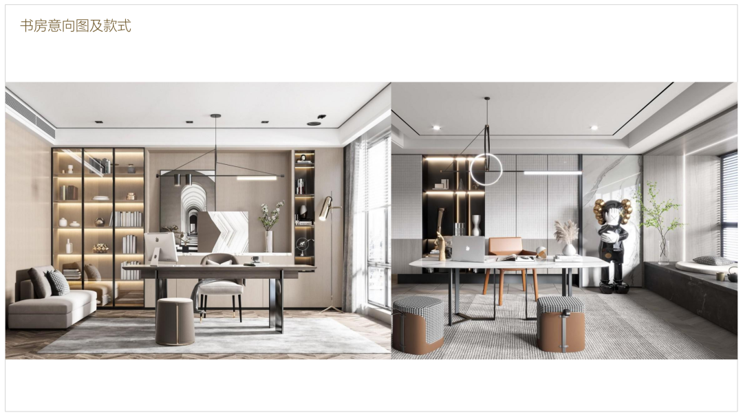 北面的小房間當(dāng)作獨(dú)立 書(shū)房使用,形式是多種多樣的,不同的風(fēng)格有不同的設(shè)計(jì)手法以及材質(zhì)的運(yùn)用都是跟風(fēng)格息息相關(guān)的,需要注意的是頂面跟側(cè)面,他跟墻體的一些收口的問(wèn)題,材料肌理的選擇,也應(yīng)該跟燈具、窗簾這些軟裝方面的東西整體統(tǒng)一起來(lái)去考慮。