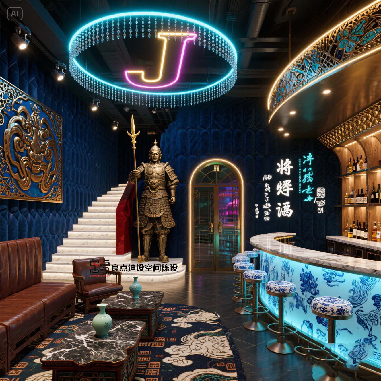 寶子們!發現一家把賽博朋克和中式美學玩出花的寶藏酒吧!進門就被3米高的霓虹"J"字燈牌暴擊??藍粉光暈+水晶珠簾 隨便拍都是電影感拉滿!