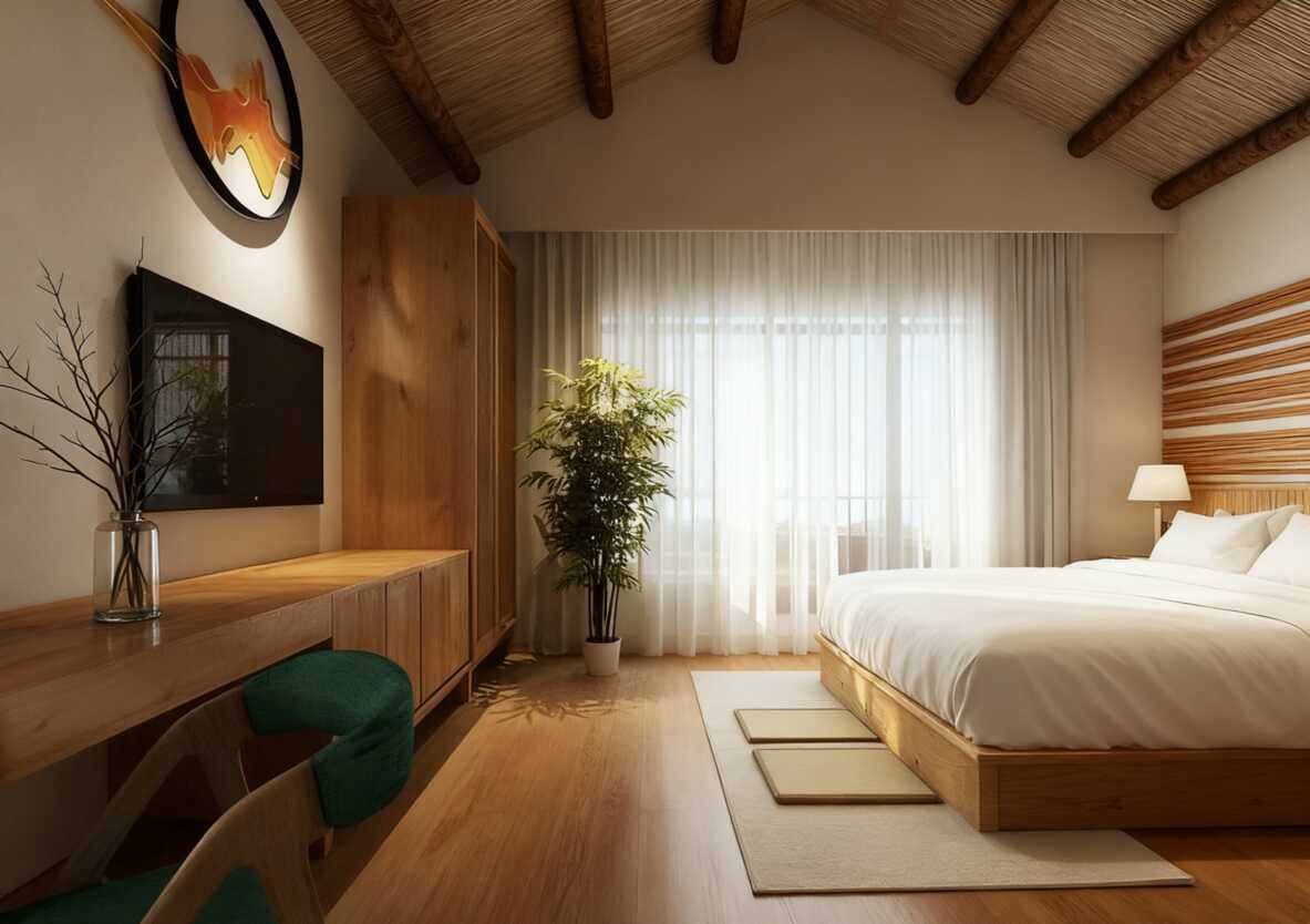 木頭選淺不選深:白橡木、櫸木代替紅木,紋路要淡得像風吹過水面[]。長沙民宿用原木格柵當隔斷,光影一照秒變日劇現場[]。