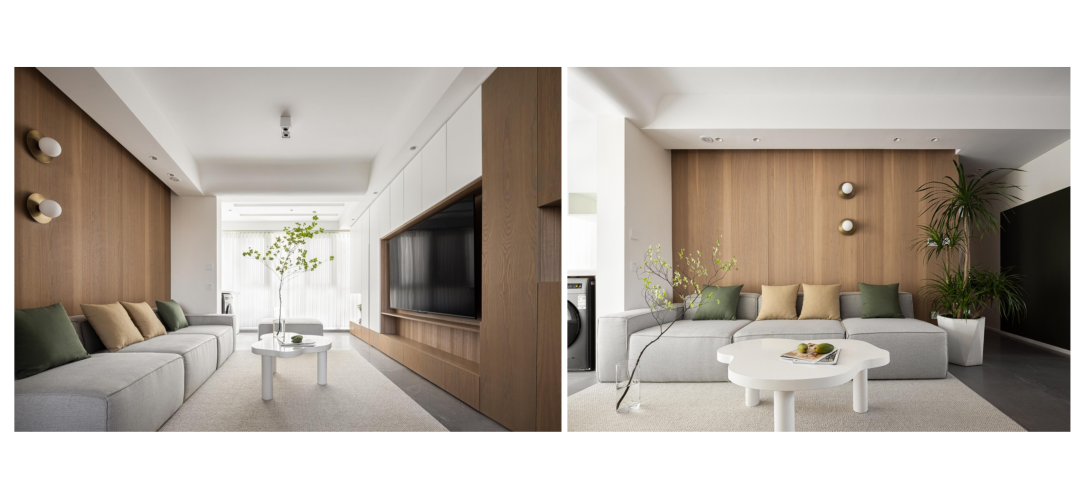 原始空間沒有做改動,入戶增加鞋帽收納柜,客廳家人休閑娛樂和會客的區域,整面電視柜滿足日常收納及書籍整理;餐廳區域滿足日常一家人的進餐;陽臺區域作為洗衣晾曬與休閑一體的生活休閑空間;從西向東的次臥依次作為長輩房、兒童房使用;主臥空間作為業主的睡眠區,同時滿足衣物收納;北次臥作為獨立書房使用。